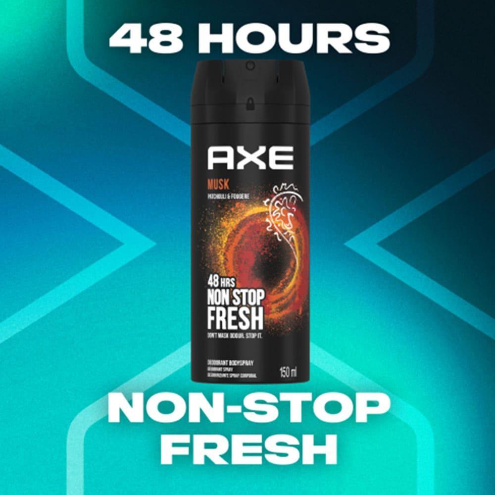 - يوفر مزيل عرق بخاخ من أكس حماية فعّالة ضد التعرق والرائحة لمدة تصل إلى 48 ساعة.